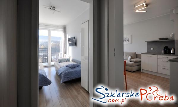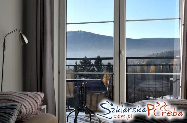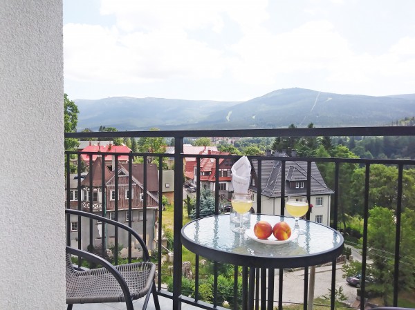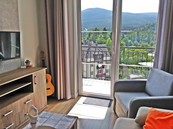 37 m2 Apartament Amika View, apartament z dużym balkonem, znajduje się na trzecim piętrze z pięknym widokiem na Karkonosze.Apartament 5 osobowy składa się z pokoju dziennego z aneksem kuchennym, sypialni i łazienki. Miejsca do spania: w sypialni dwa pojedyńcze łóżka które można zsunąć jako jedno podwójne i fotel rozkładany jednoosobowy, w pokoju dziennym rozkładana sofa dwuosobowa.Apartament wyposażony jest w niezbędne urządzenia i sprzęt, między innymi w bezprzewodowy internet, telewizor z Netflix, suszarkę do włosów, żelazko, deskę do prasowania, rozkładaną suszarkę itp.