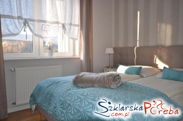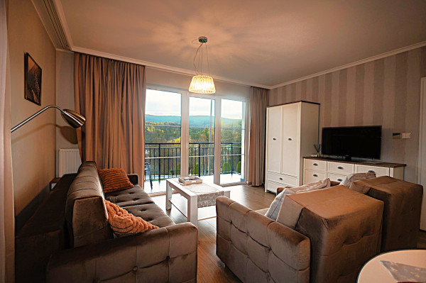43 m2 Apartament Montain View nr 2 z dwoma balkonami znajduje się na parterze z widokiem na Karkonosze. Apartament 6 osobowy składa się z pokoju dziennego z aneksem kuchennym, sypialni i łazienki. Miejsca do spania: w sypialni pojedyńcze dwa łóżka zsunięte które można rozsunąć, w pokoju dziennym dwie dwuosobowe sofy rozkładane. W przypadku konieczności rozłożenia dwóch sof (nocleg dla 6 osób) konieczne jest przesunięcie na noc stołu z krzesłami. Apartament wyposażony jest w niezbędne urządzenia i sprzęt, między innymi w bezprzewodowy internet, telewizor z Netflix, zmywarkę do naczyń, suszarkę do włosów, żelazko, deskę do prasowania, rozkładaną suszarkę itp.