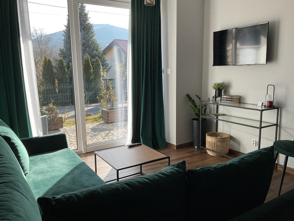 38 m2 Do dyspozycji gości sypialnia z podwójnym łóżkiem oraz płaskim telewizorem, salon z rozkładaną dwuosobową kanapą, stół jadalny dla 4 osób, płaski telewizor, bezpłatne WI-FI, w pełni wyposażony aneks kuchenny, łazienka oraz taras z przepięknym widokiem na Karkonosze. Pościel i ręczniki w cenie. Przy apartamencie, prywatne miejsce parkingowe.